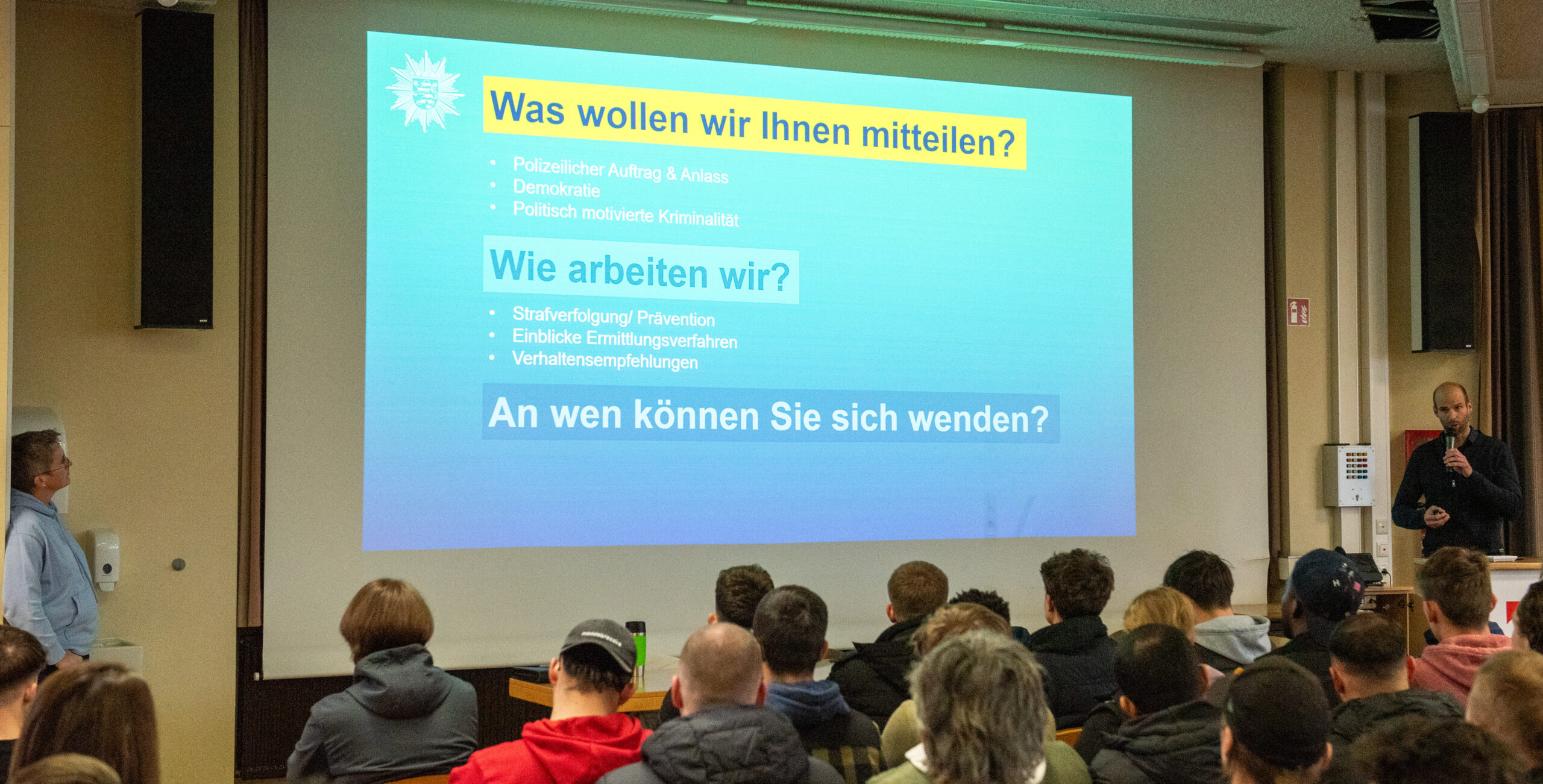 An der Ferdinand-Braun-Schule in Fulda fand nach den Herbstferien aufgrund des hohen Interesses der Schülerinnen und Schüler zwei Veranstaltungen des Polizeipräsidiums Osthessen zum Thema „Polizeiliche Prävention in der Schule – Sensibilisierung und Nachbereitung“ statt. Nach der Begrüßung durch die Schulleiterin Frau OStDin Ulrike Vogler, übernahmen Frau Diana Kalbfleisch, Zentrale Jugendkoordinatorin, sowie Herr Christian Diegelmann, wissenschaftlicher Mitarbeiter beim Polizeipräsidium Osthessen die Vorstellung und Leitung der Veranstaltung.Herr Diegelmann startete die Veranstaltung mit der Vorstellung des Vortragsthemas, nämlich Politisch Motivierte Kriminalität (PMK) und somit mit dem Ansprechen der Bereiche Rechtsextremismus, Linksextremismus und religiöser Extremismus. Im Verlauf seines Vortrags ging er auf verschiedene Aspekte
