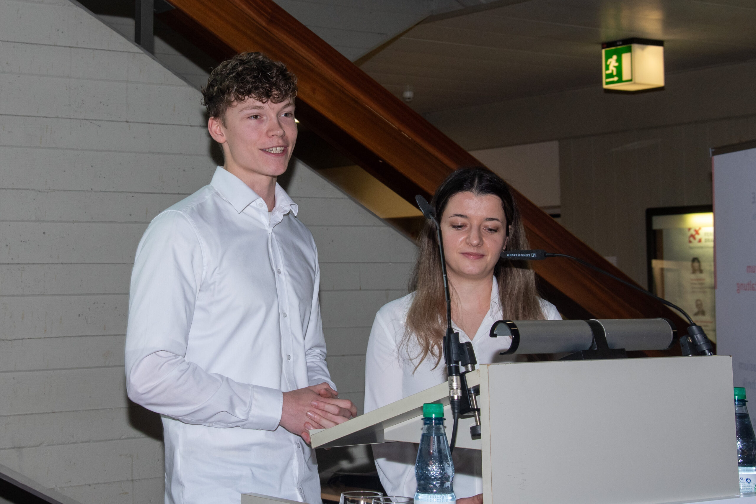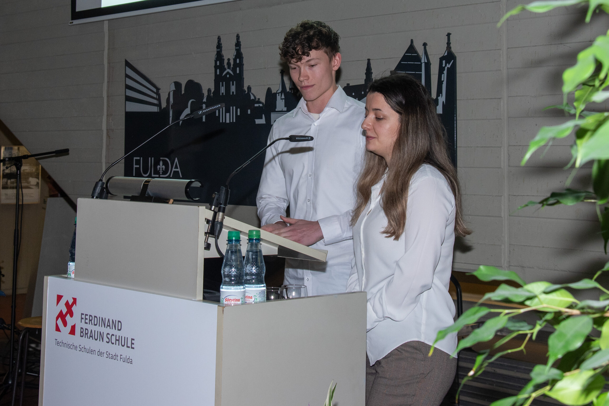 Die Abschiedsworte für die Absolventinnen und Absolventen der Berufsschule sprachen Frau Milena Suvajac und Herr Marvin Eschenbach, beide ehem. Auszubildende zu Fachinformatikern FR Anwendungsentwicklung. Sie resümierten die vergangenen Jahre aus Sicht der Auszubildenden, oft mit einem Augenzwinkern versehen, bevor die Absolventinnen und Absolventen ihre Zeugnisse aus den Händen der Klassenlehrkräfte erhielten.