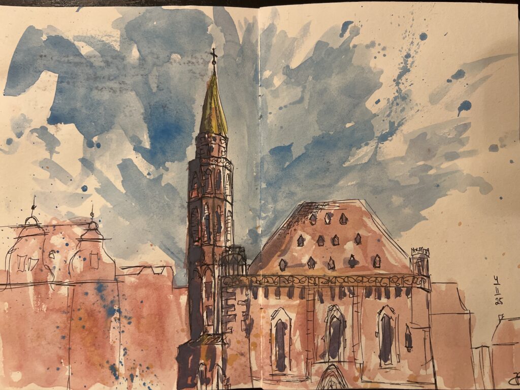 Während die Klasse 12FOG1 im „museum angewandte kunst“ im Rahmen eines Workshops töpfert, fertigt die Klasse 11FOG1 ihre Skizzen im Format des Urban Sketchings am Römerberg an.