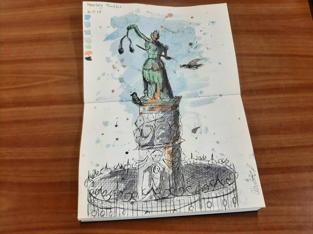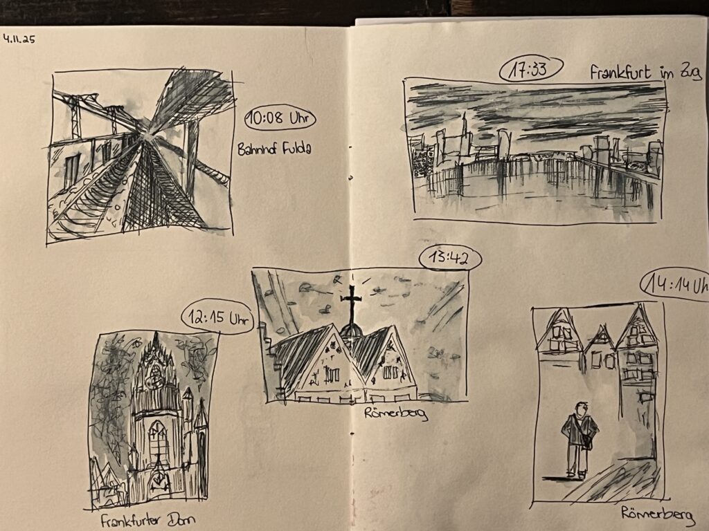 Die Klasse 11FOG1 hat mit ihrem Klassenlehrer Marius Laibach vom 03.11. bis zum 06.11.25 am Gestalterkurs im Bonifatiushaus Fulda teilgenommen. Gemeinsam mit Schülerinnen und Schülern aus dem staatlichen Berufsbildungszentrum Bad Salzungen wurden die künstlerischen Grundlagen des Urban Sketchings erworben und in Frankfurt am Römerberg praktisch umgesetzt. Der Künstler Wolf Mihm und die Illustratorin Martina Theisen haben für das künstlerische Know-how während der vier Tage gesorgt. Ivona Gebala und Frank Schiffhauer haben – wie in jedem Jahr – den Kurs mit viel Engagement geplant und geleitet. Neben dem künstlerischen Schwerpunkt wurden ebenfalls gesellschaftskritische Themen in den Fokus der Betrachtung gestellt.