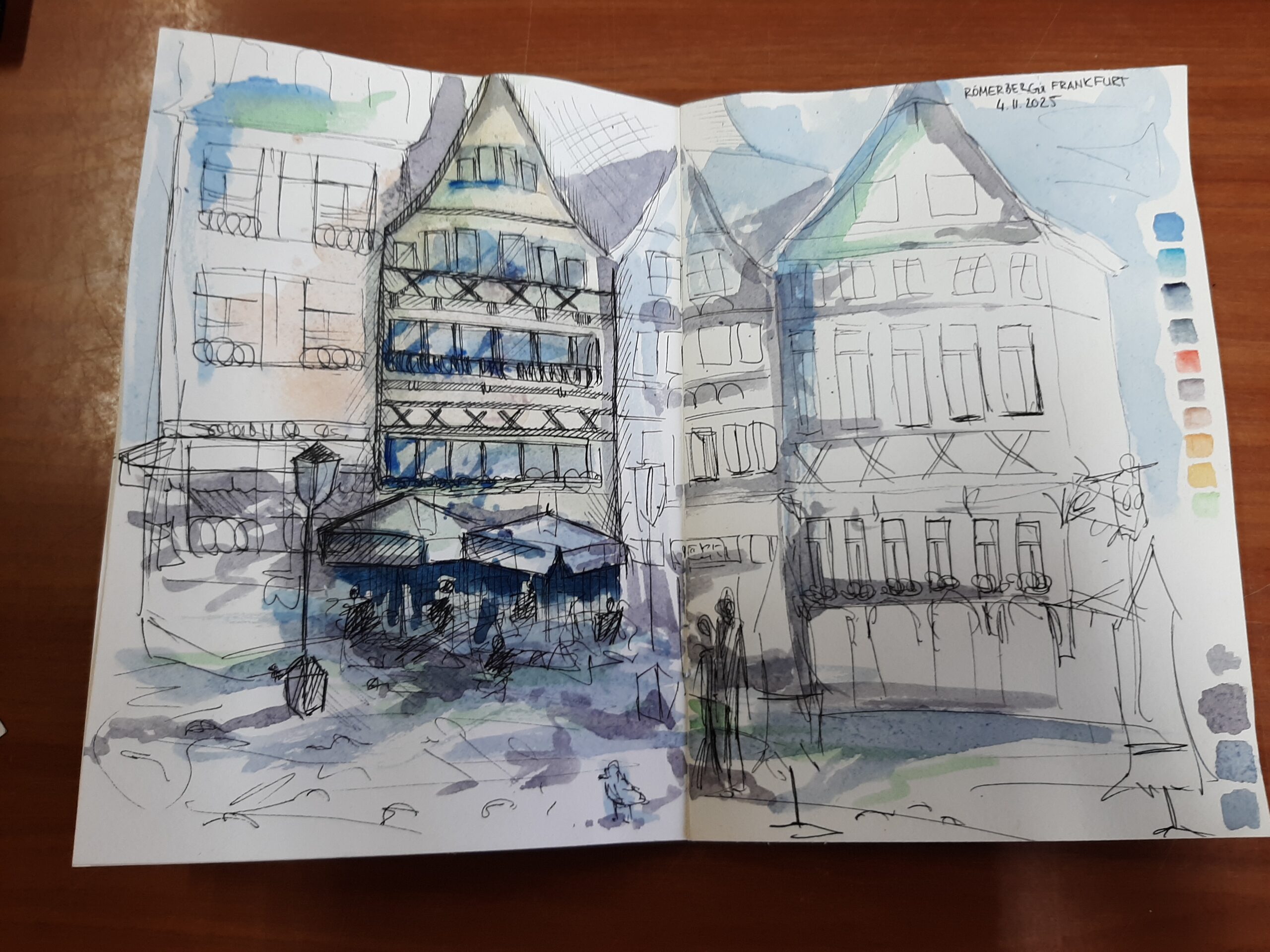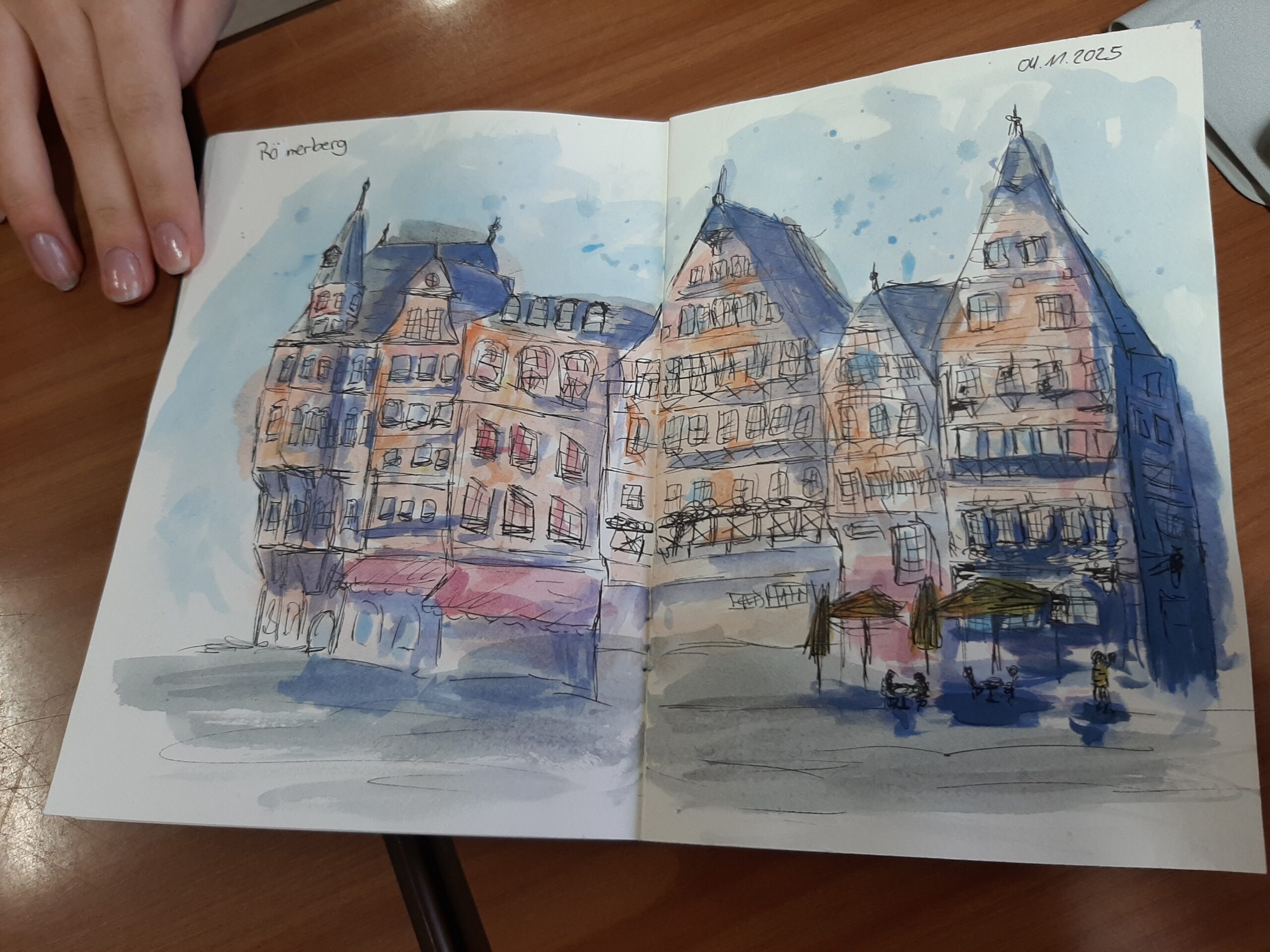Die Klasse 11FOG1 hat mit ihrem Klassenlehrer Marius Laibach vom 03.11. bis zum 06.11.25 am Gestalterkurs im Bonifatiushaus Fulda teilgenommen. Gemeinsam mit Schülerinnen und Schülern aus dem staatlichen Berufsbildungszentrum Bad Salzungen wurden die künstlerischen Grundlagen des Urban Sketchings erworben und in Frankfurt am Römerberg praktisch umgesetzt. Der Künstler Wolf Mihm und die Illustratorin Martina Theisen haben für das künstlerische Know-how während der vier Tage gesorgt. Ivona Gebala und Frank Schiffhauer haben – wie in jedem Jahr – den Kurs mit viel Engagement geplant und geleitet. Neben dem künstlerischen Schwerpunkt wurden ebenfalls gesellschaftskritische Themen in den Fokus der Betrachtung gestellt.