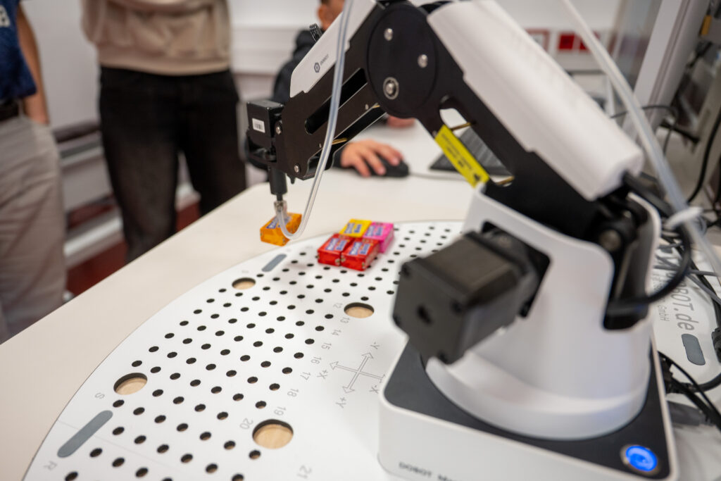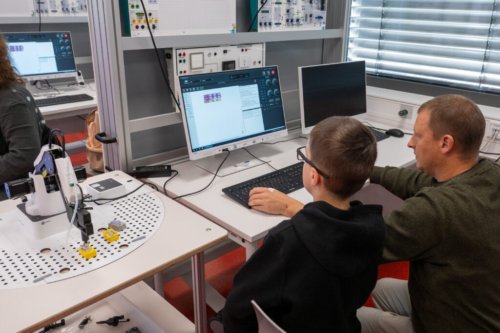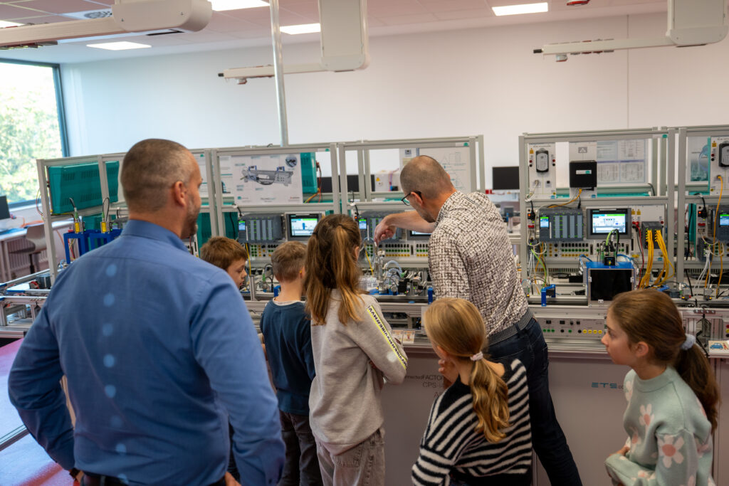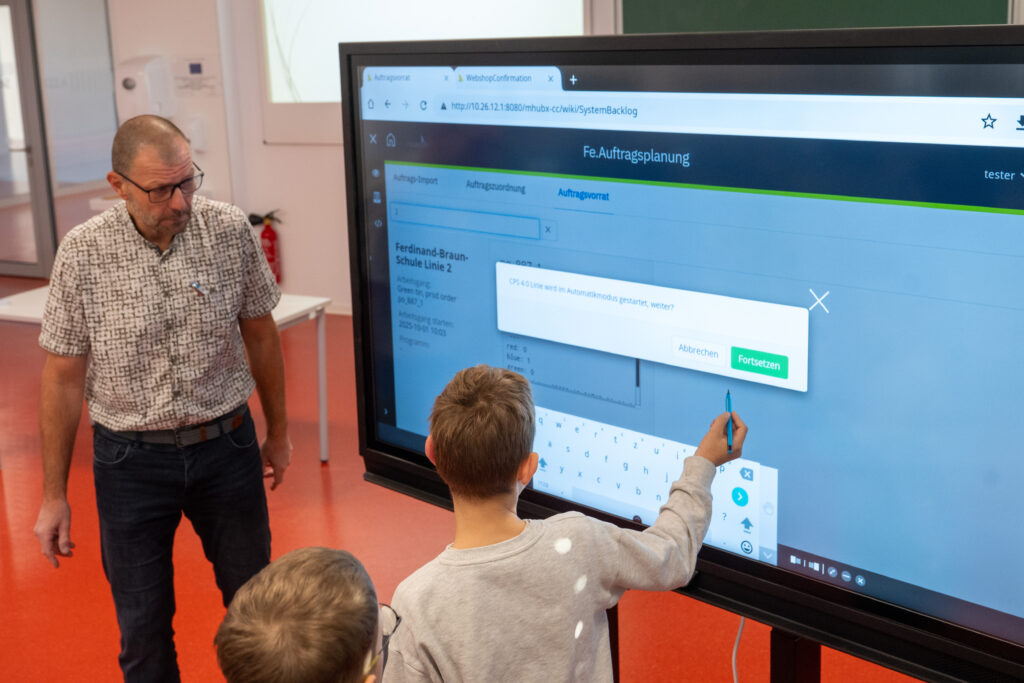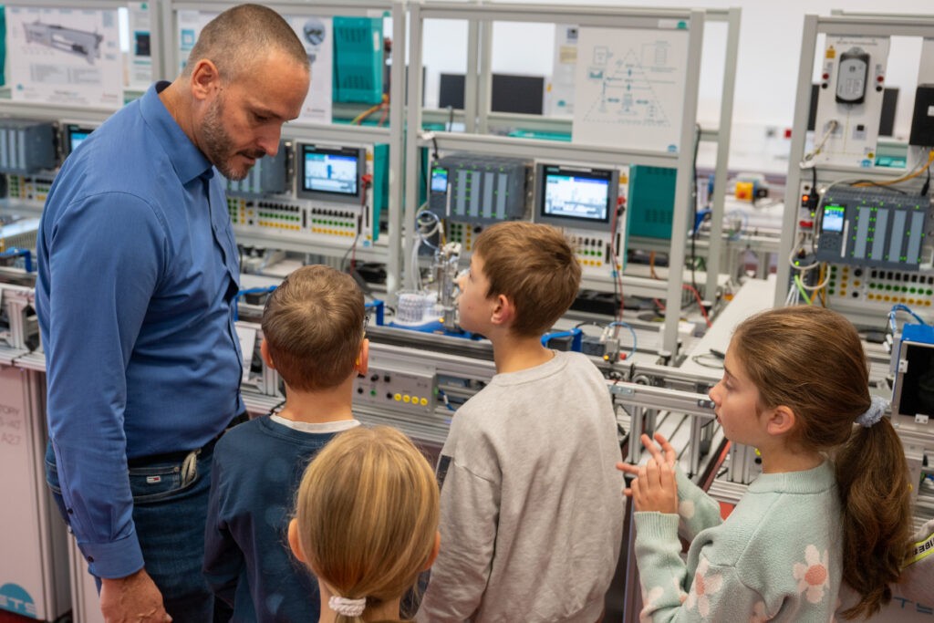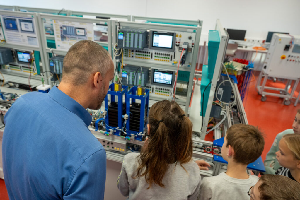 Ein weiteres Highlight war der Besuch der „Smart Factory“ im neuen Automatisierungszentrum der FBS. Hier erhielten die Kinder einen Eindruck davon, wie eine moderne Fabrik der Zukunft aussehen könnten bzw. heutzutage auch schon aussieht. Die Bemerkung einer Schülerin, dass in der Fabrik der Zukunft „keine“ Menschen mehr zu sehen seien, griff Sebastian Stolz auf und erklärte, dass Menschen weiterhin eine wichtige Rolle spielen werden, indem sie ihre automatisierten „Kolleginnen und Kollegen“ anleiten. Dies durften die Schülerinnen und Schüler dann auch anschließenden bei der Programmierung von Robotern im Robotik-Labor so erleben.