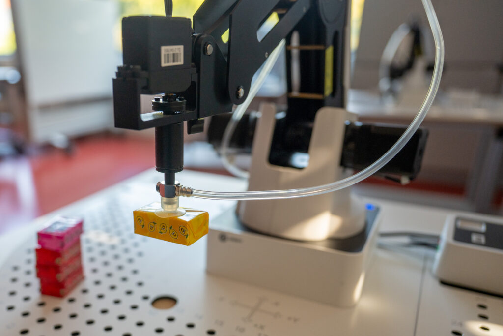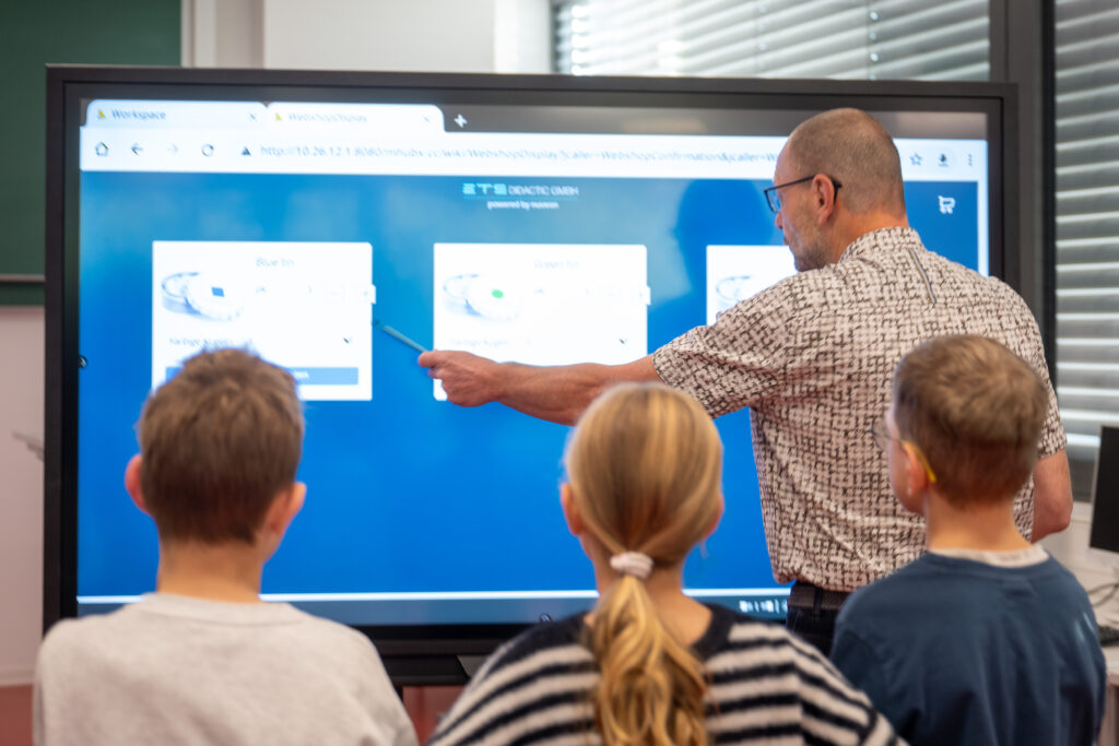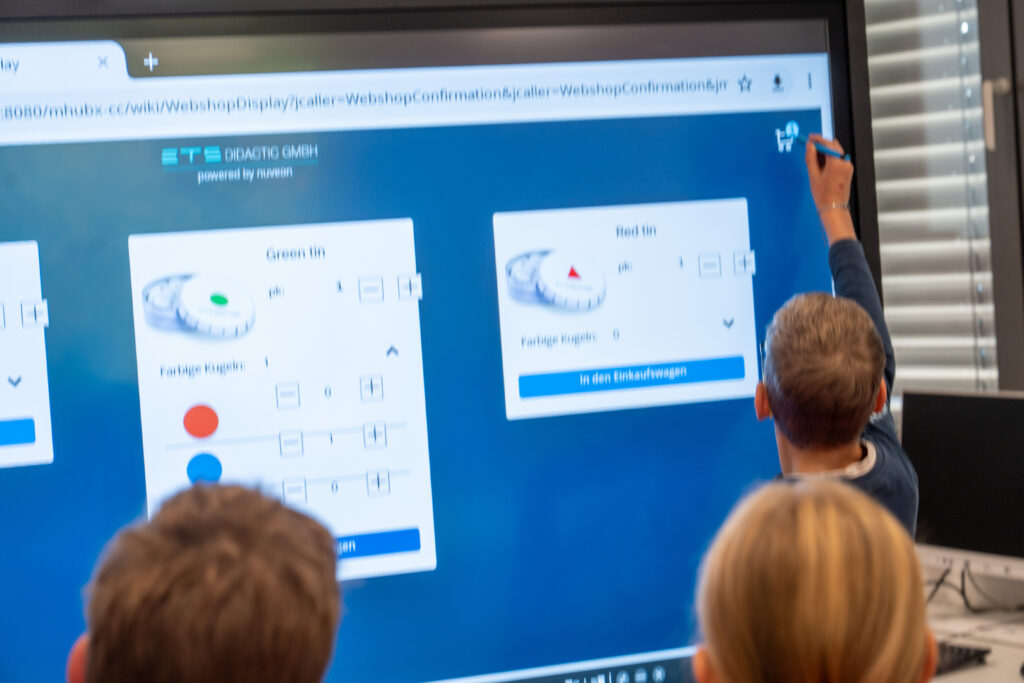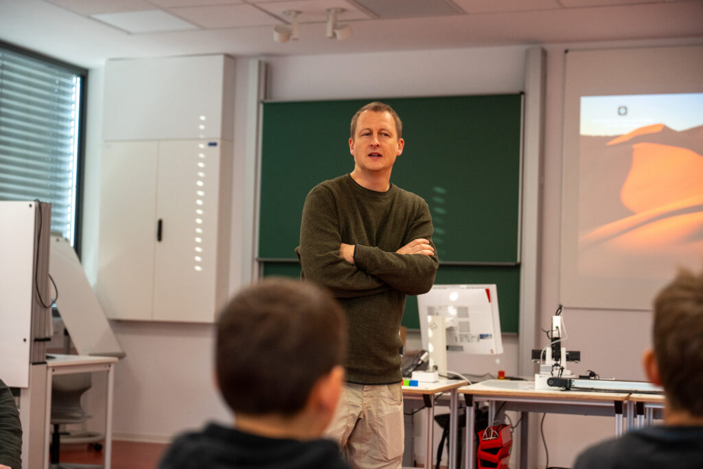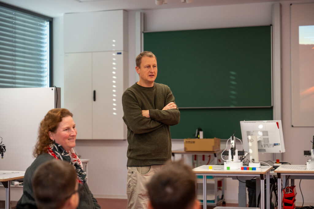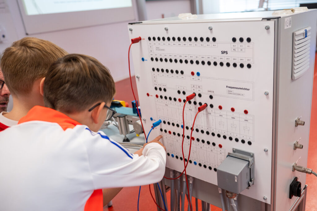 Ein weiteres Highlight war der Besuch der „Smart Factory“ im neuen Automatisierungszentrum der FBS. Hier erhielten die Kinder einen Eindruck davon, wie eine moderne Fabrik der Zukunft aussehen könnten bzw. heutzutage auch schon aussieht. Die Bemerkung einer Schülerin, dass in der Fabrik der Zukunft „keine“ Menschen mehr zu sehen seien, griff Sebastian Stolz auf und erklärte, dass Menschen weiterhin eine wichtige Rolle spielen werden, indem sie ihre automatisierten „Kolleginnen und Kollegen“ anleiten. Dies durften die Schülerinnen und Schüler dann auch anschließenden bei der Programmierung von Robotern im Robotik-Labor so erleben.
