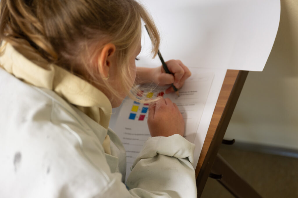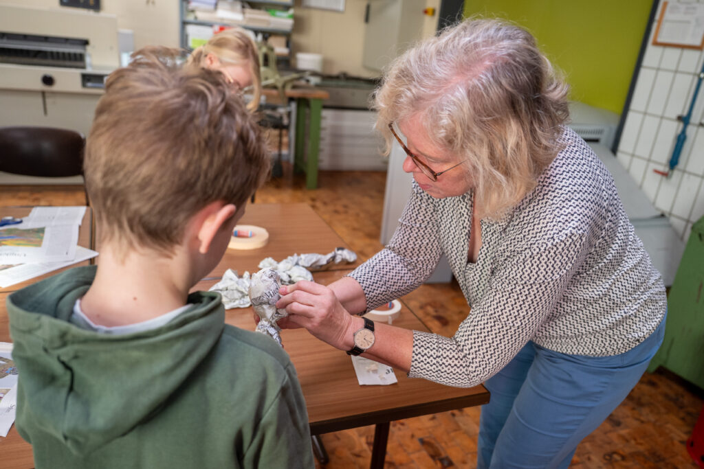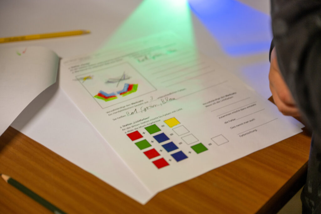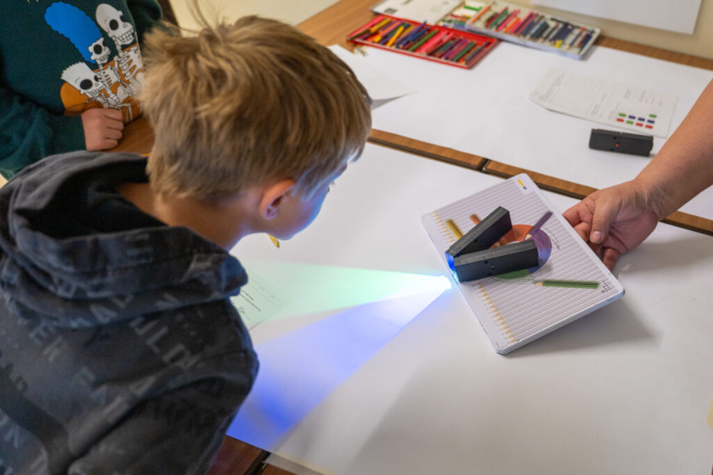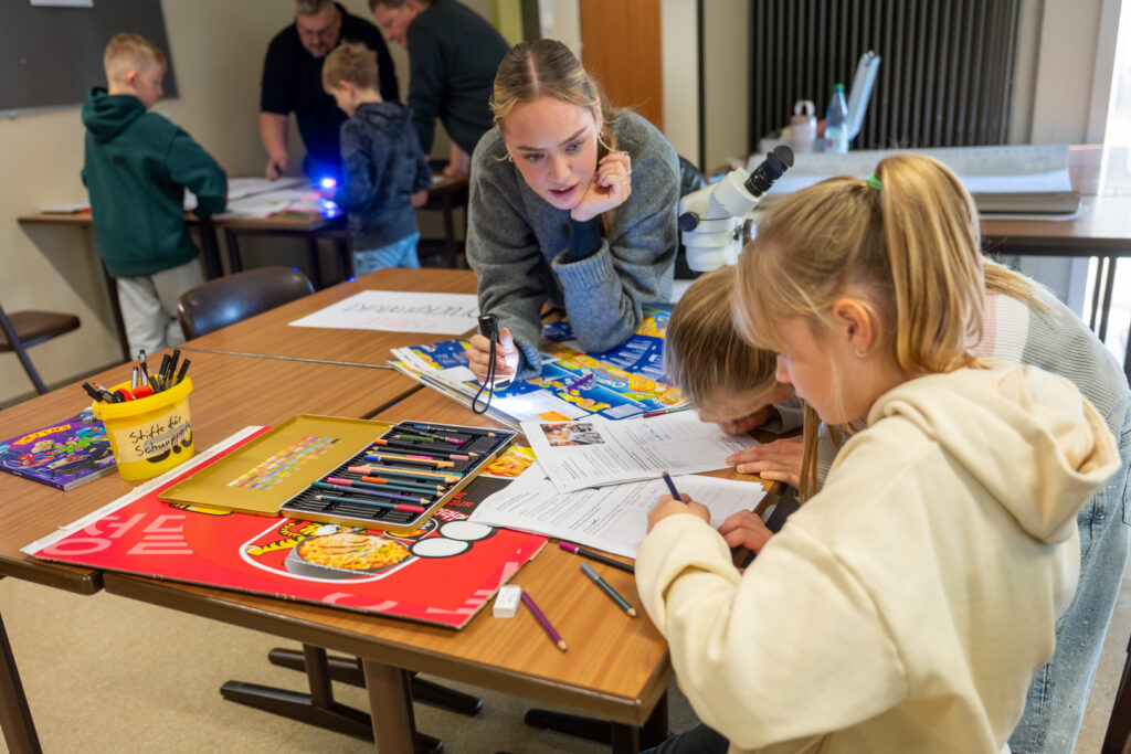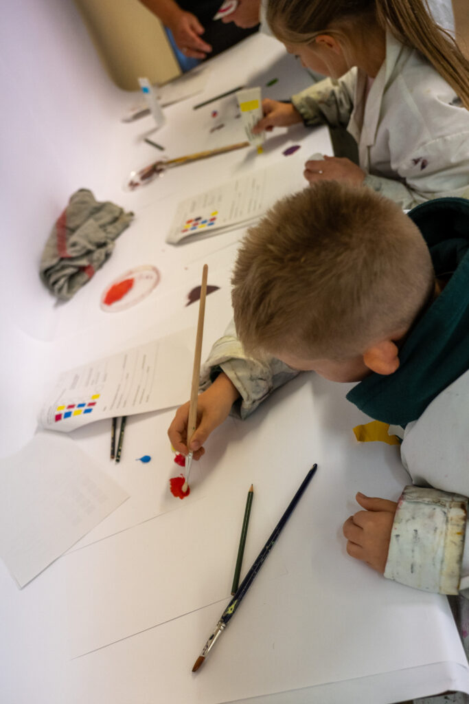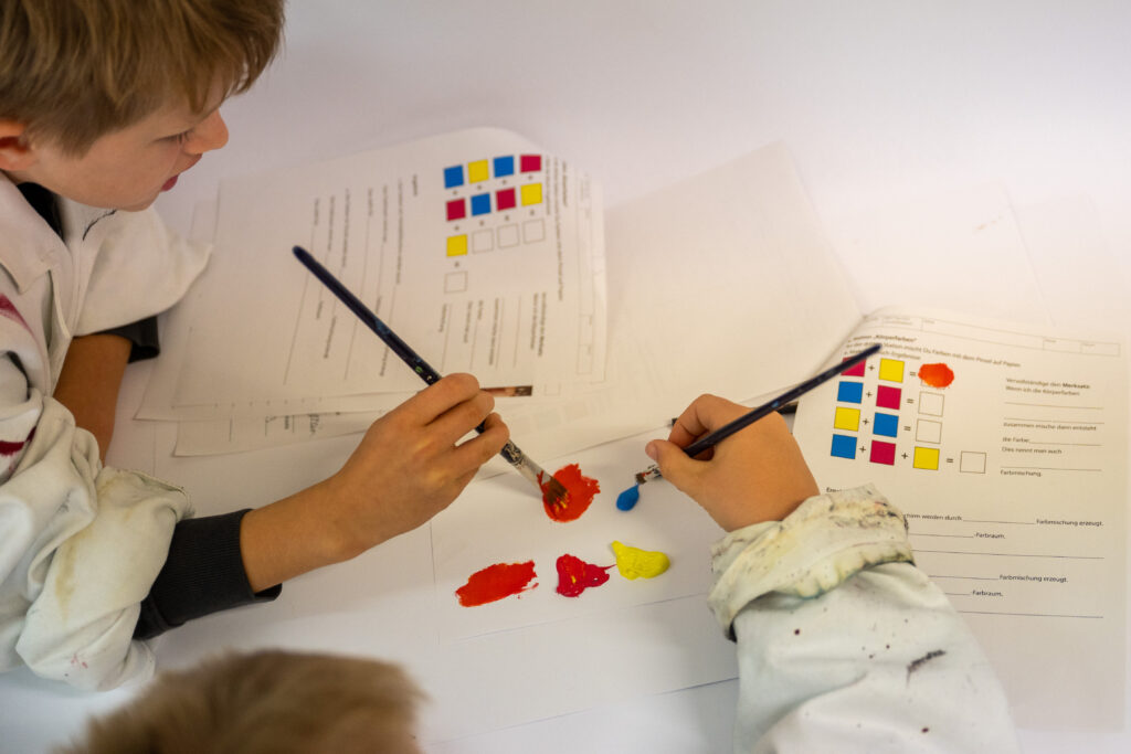 Auch im Bereich der Gestaltungstechnik konnten die Kinder neue Erfahrungen sammeln. In zwei Workshops schlüpften sie in die Rolle von Detektiven, um die Geheimnisse der Farben zu erforschen und zu entdecken, welche kreativen Möglichkeiten sich daraus ergeben. Zudem war handwerkliches Geschick gefragt, als die Schülerinnen und Schüler bei Frau Froneck-Kramer mit Papier und Kreppband ihrer Kreativität freien Lauf lassen konnten. Die kleinen Gäste durften erfahren, wie sich „Gefühle“ in Form bringen lassen – und dass nur mit Papier und Klebeband.