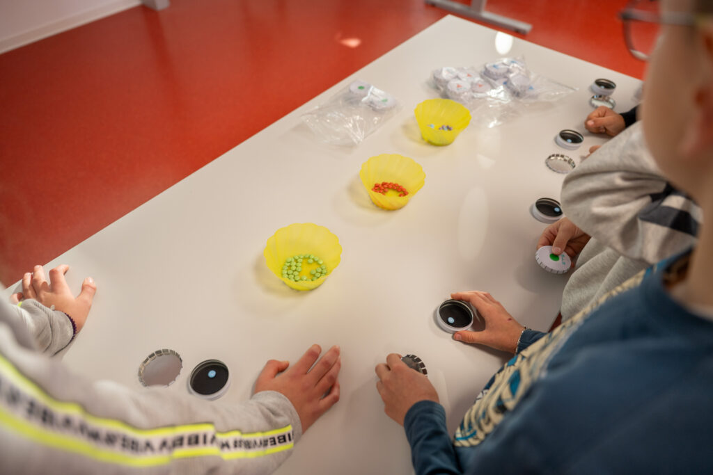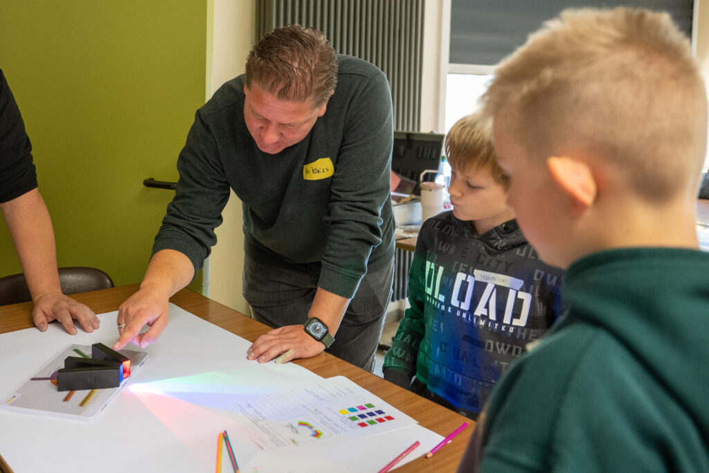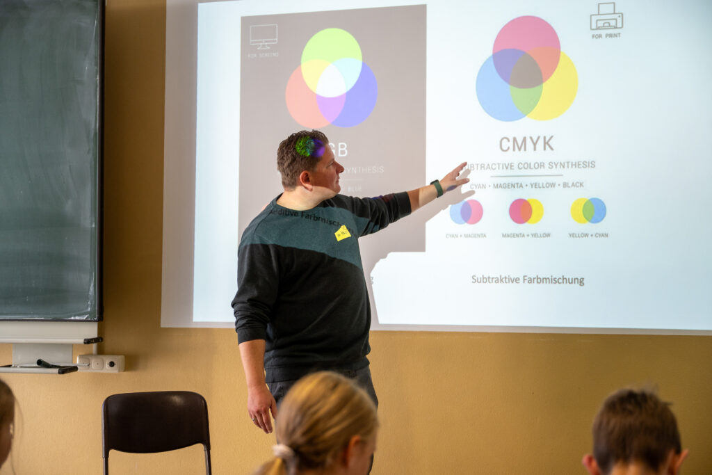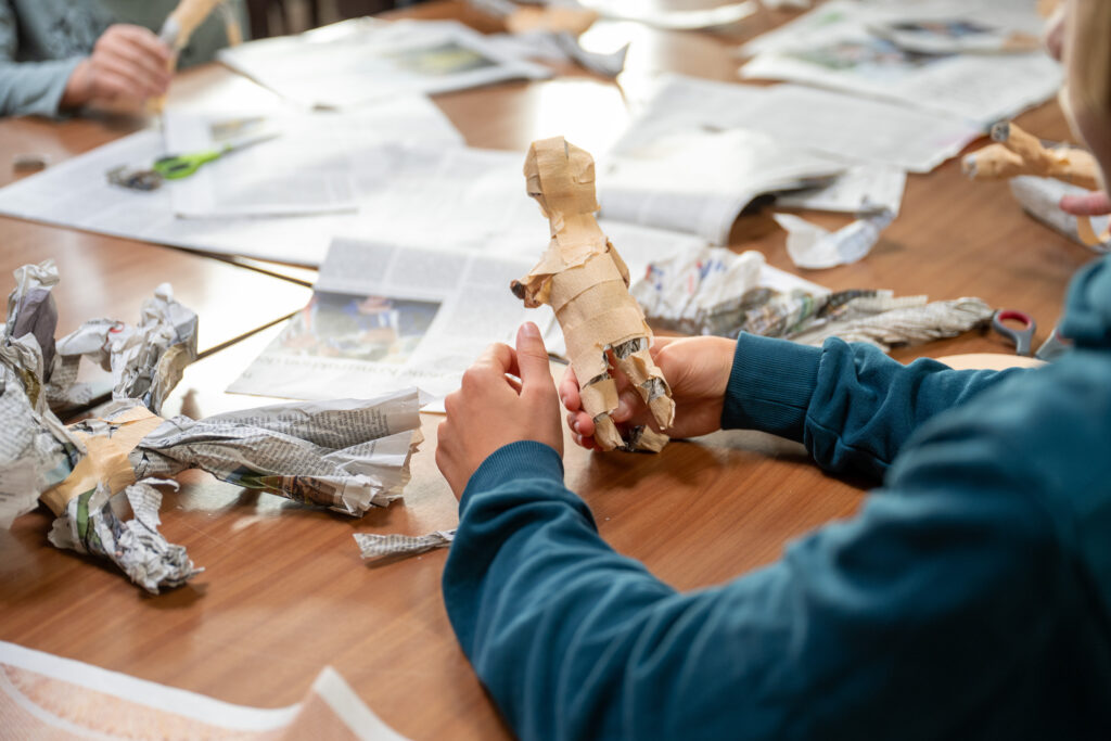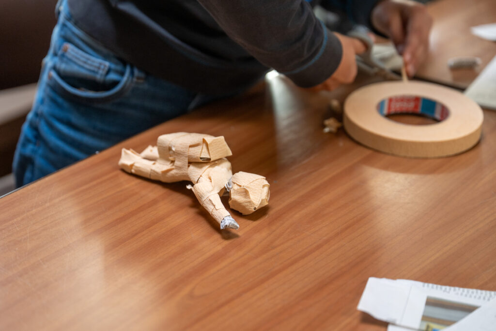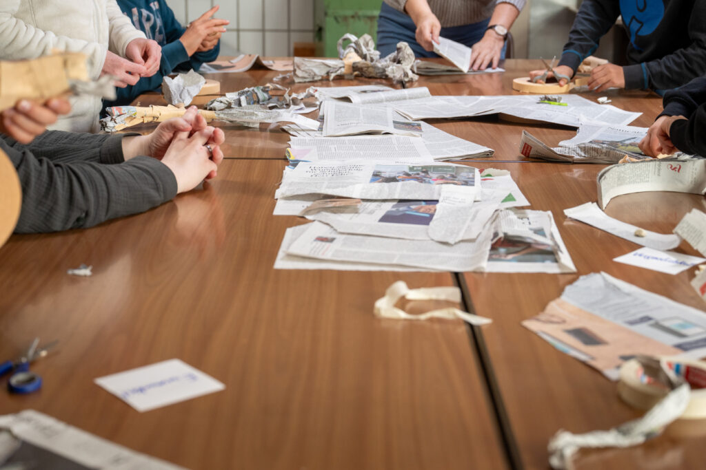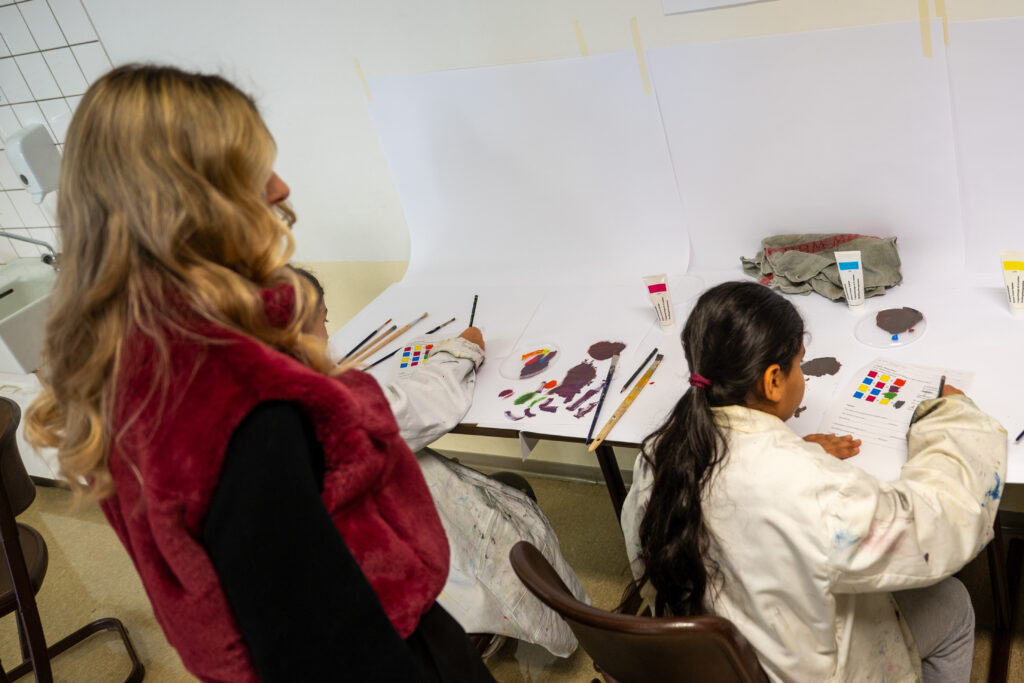 Auch im Bereich der Gestaltungstechnik konnten die Kinder neue Erfahrungen sammeln. In zwei Workshops schlüpften sie in die Rolle von Detektiven, um die Geheimnisse der Farben zu erforschen und zu entdecken, welche kreativen Möglichkeiten sich daraus ergeben. Zudem war handwerkliches Geschick gefragt, als die Schülerinnen und Schüler bei Frau Froneck-Kramer mit Papier und Kreppband ihrer Kreativität freien Lauf lassen konnten. Die kleinen Gäste durften erfahren, wie sich „Gefühle“ in Form bringen lassen – und dass nur mit Papier und Klebeband.