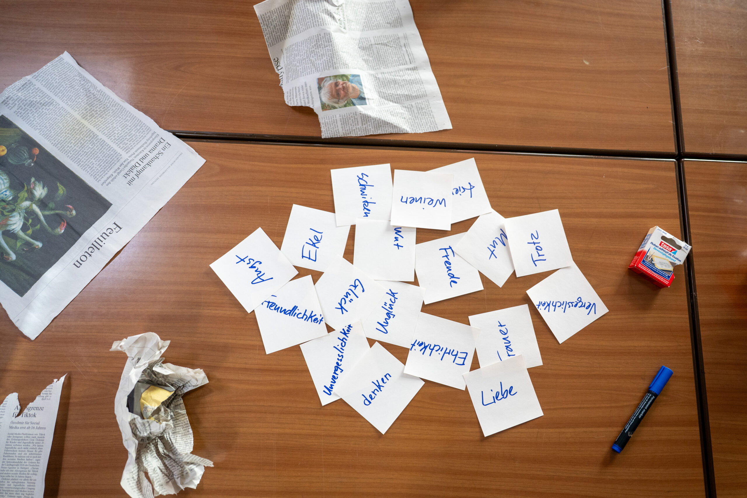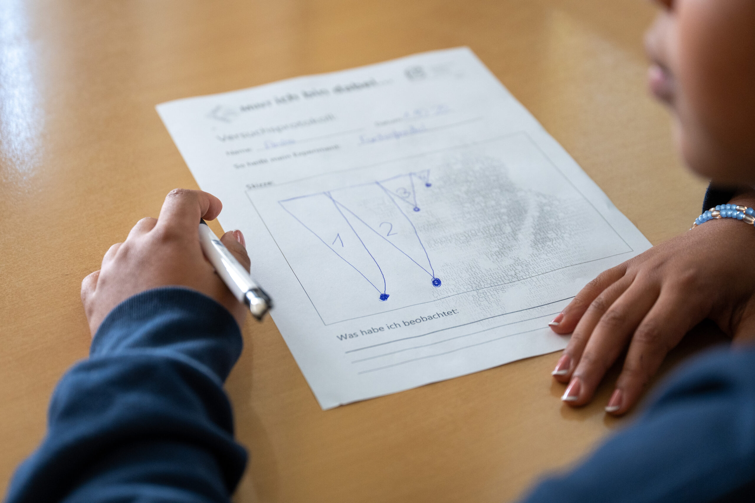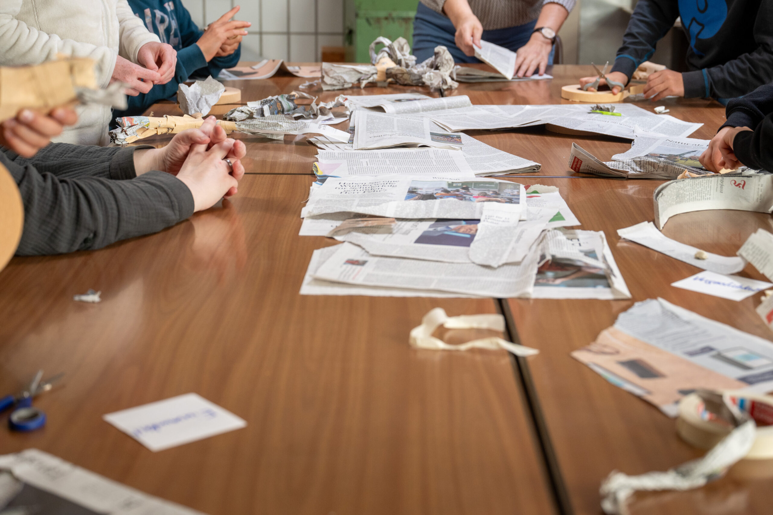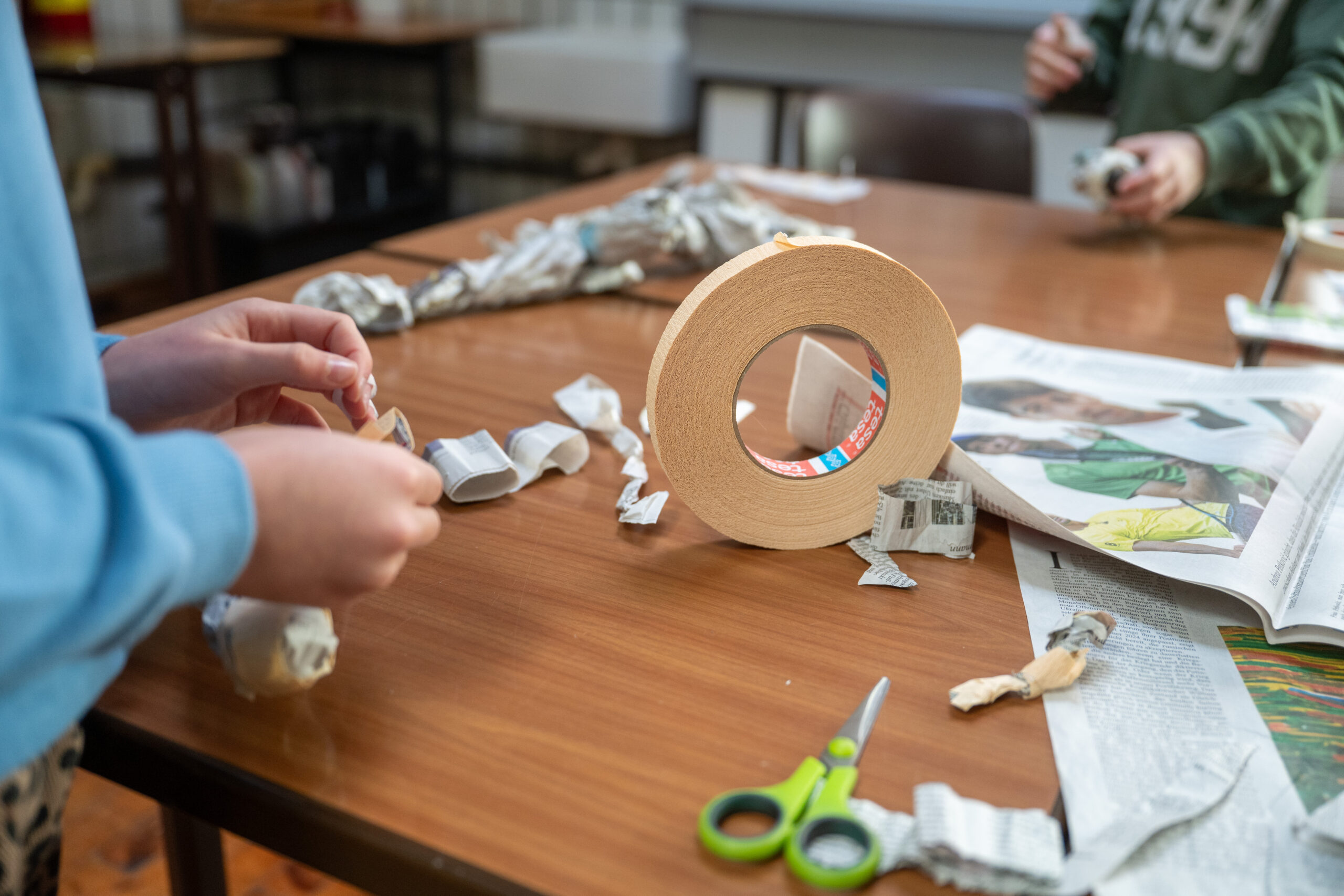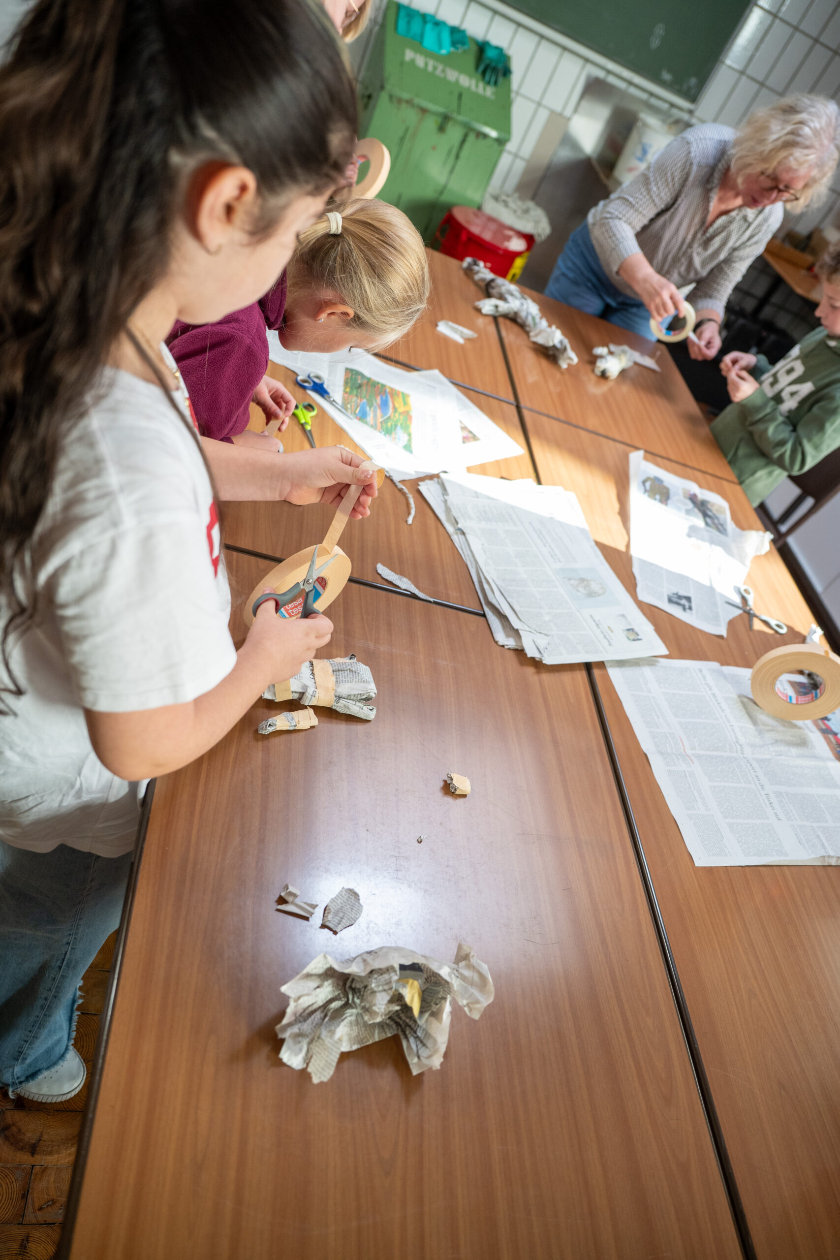 Auch im Bereich der Gestaltungstechnik konnten die Kinder neue Erfahrungen sammeln. In zwei Workshops schlüpften sie in die Rolle von Detektiven, um die Geheimnisse der Farben zu erforschen und zu entdecken, welche kreativen Möglichkeiten sich daraus ergeben. Zudem war handwerkliches Geschick gefragt, als die Schülerinnen und Schüler bei Frau Froneck-Kramer mit Papier und Kreppband ihrer Kreativität freien Lauf lassen konnten. Die kleinen Gäste durften erfahren, wie sich „Gefühle“ in Form bringen lassen – und dass nur mit Papier und Klebeband.
