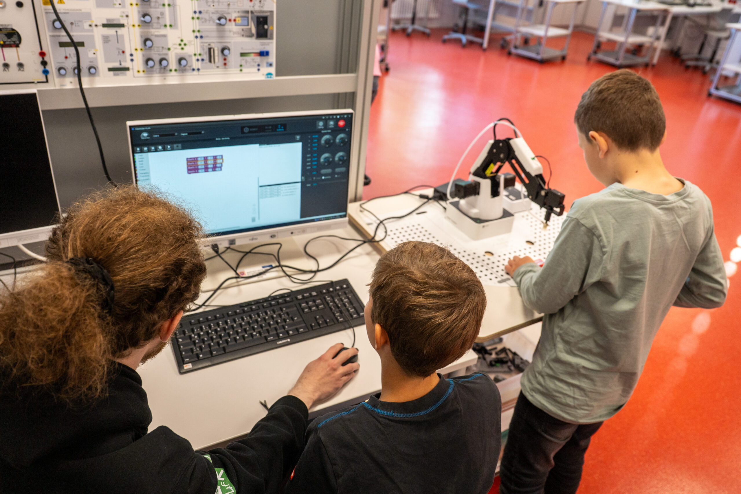 Ein weiteres Highlight war der Besuch der „Smart Factory“ im neuen Automatisierungszentrum der FBS. Hier erhielten die Kinder einen Eindruck davon, wie eine moderne Fabrik der Zukunft aussehen könnten bzw. heutzutage auch schon aussieht. Die Bemerkung einer Schülerin, dass in der Fabrik der Zukunft „keine“ Menschen mehr zu sehen seien, griff Sebastian Stolz auf und erklärte, dass Menschen weiterhin eine wichtige Rolle spielen werden, indem sie ihre automatisierten „Kolleginnen und Kollegen“ anleiten. Dies durften die Schülerinnen und Schüler dann auch anschließenden bei der Programmierung von Robotern im Robotik-Labor so erleben.